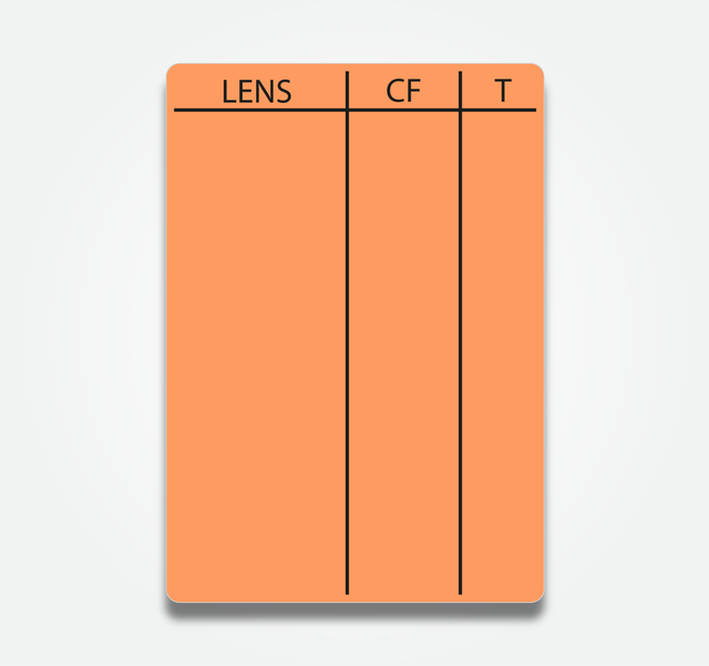 Our Lens Tables are available in white, plus a range of pastels and brights. All come supplied with Velcro backing and are just what is needed when you want a summary of all the lenses, their Close Focus and their T-Stop values on the operator side of the camera or on the 1st AC's focus rig for when important info needs to be referenced quickly but with a bit of colour.